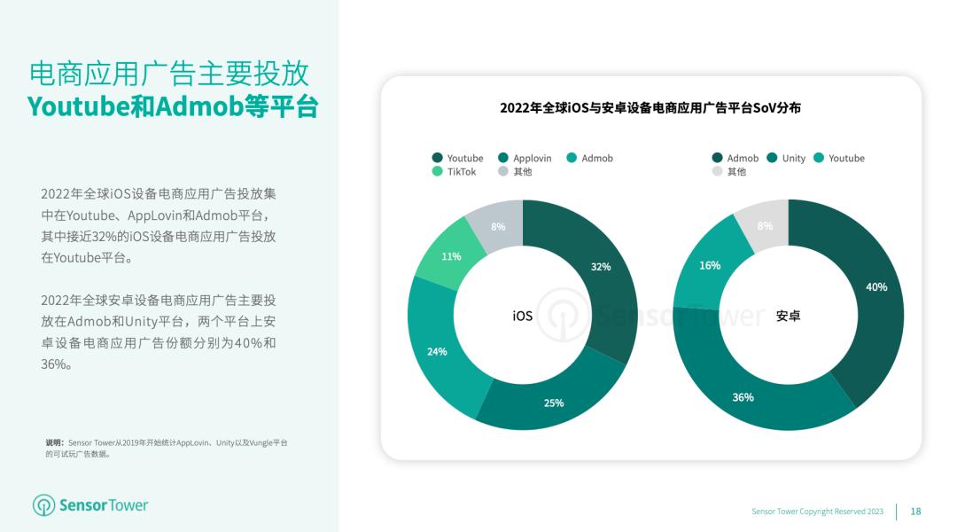 2022年,Youtube和Admob成为全球电商应用广告的重要投放平台,其中接近32%的iOS设备电商应用广告投放在Youtube平台,40%的安卓设备电商应用广告投放在Admob平台。