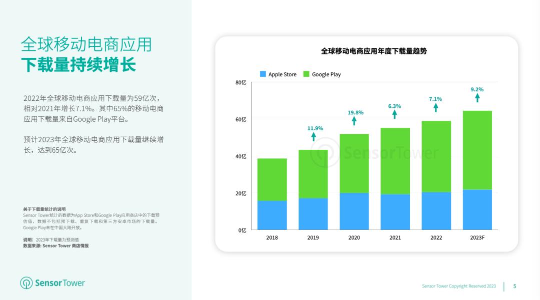 2023年移动电商应用市场洞察:2022年全球移动电商应用下载量增长7.1%至59亿次,预计2023年下载量增长达65亿次