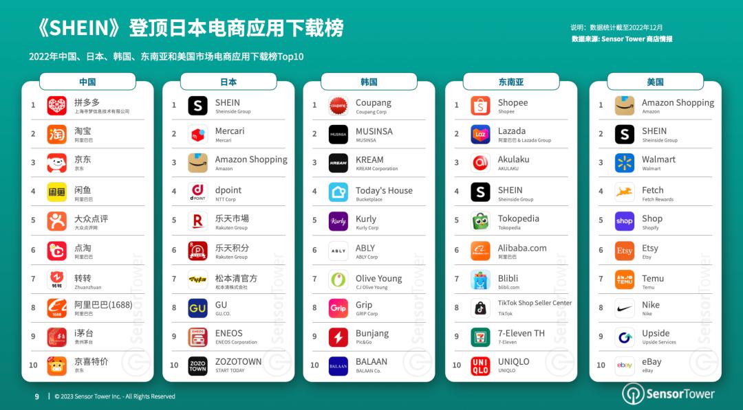 来自中国的快时尚出海电商《SHEIN》成为2022年日本市场下载量最大的电商应用,与此同时《SHEIN》在美国、东南亚和拉丁美洲等多个海外市场表现突出。