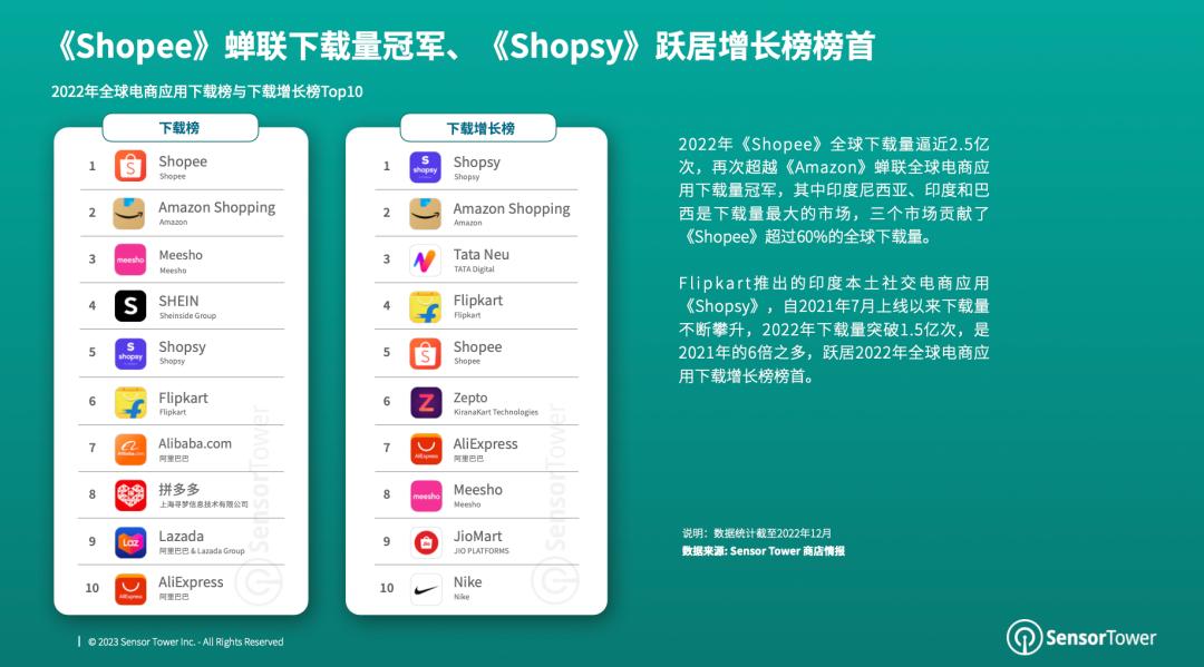 2022年,东南亚电商应用《Shopee》以近2.5亿次下载量,再次超越《Amazon》蝉联全球电商应用下载冠军,其中印度尼西亚、印度和巴西是下载量最大的市场。