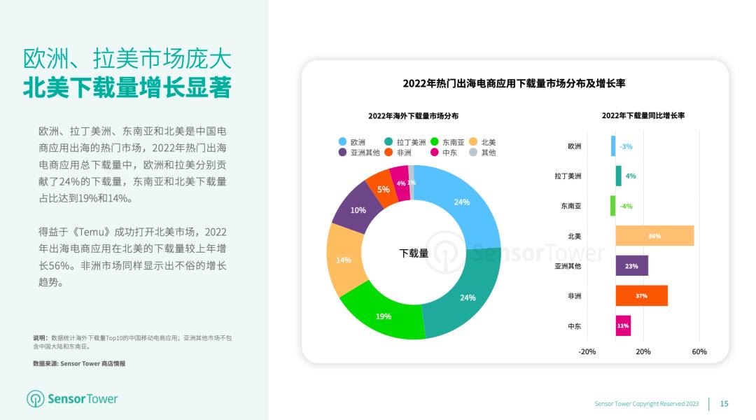 欧洲、拉丁美洲、东南亚和北美成为中国电商应用出海的热门市场,2022年热门出海电商应用总下载量中,分别有24%、24%、19%和14%的下载量来自以上市场。《Temu》在北美市场的快速走红,使得2022年出海电商应用在该市场的下载量环比增长56%。