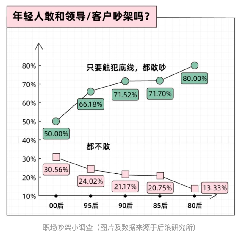 根据后浪研究所的调研结果显示,近7成90后在受到不公待遇时敢于和领导、客户对刚,只有20%左右的90后,完全不敢和领导、客户吵架。