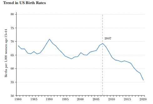 但这种稳定被经济危机催生的风暴瞬间摧毁。截止到2020年,美国的出生率衰减成每1000名15-44岁的女性生育55.8个新生儿,比2007年的69.3人下降了近20%。