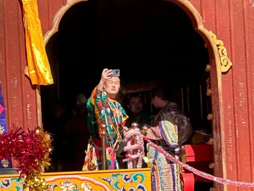 这是一场被高度期待的法会,因为疫情缘故已经停办了三年。当头戴龙角面具,穿着各色彩衣的演员引着大师与几位喇嘛出来时,几乎所有人都掏出了手机拍照。一位穿着黑色皮衣的大哥将手机高高举起,全程录像几小时,当扮演仙官的演员将“小鬼”捉住时,他一边举着手机,一边不断鞠躬作揖,口中小声念叨着愿望。