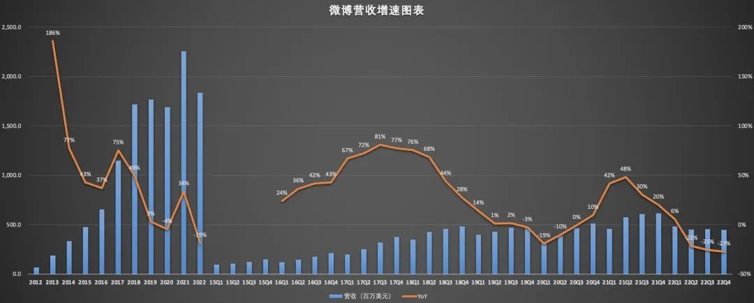 数据显示,微博2022年第四季度实现净收入4.48亿美元,同比下降27%,这是微博2022年连续三个季度营收负增长。全年来看,微博2022年实现营收18.4亿美元,同比下降19%。