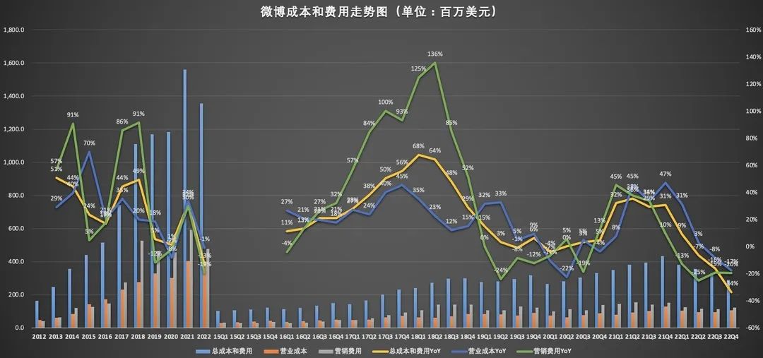 2022年,微博在降本增效方面有了很大改善。数据显示,2022年第四季度,微博总成本和费用为2.875亿美元,与上年同期相比减少33.7%,约1.5亿美元。2022全年总成本和费用为13.56亿美元,同比减少13.1%,约2亿美元。