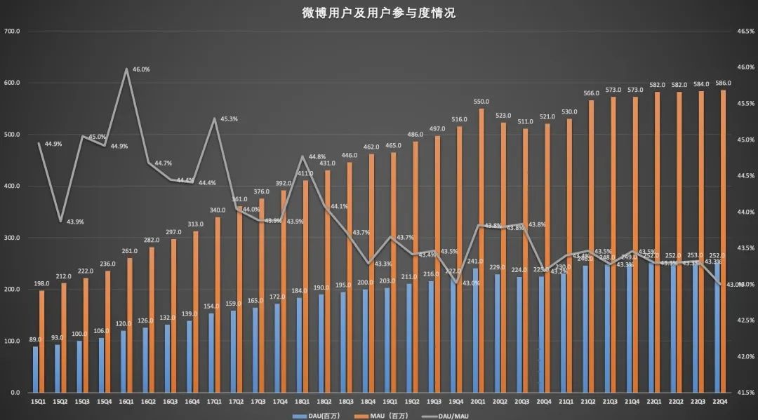 这样一看数据还不错。不过,如果从日活跃用户以及用户参与来看,就不那么乐观了。2022年第四季度,微博日活跃用户相比三季度的2.53亿下滑了0.4%,用户参与度(DAU/MAU)从为43%,低于上年同期的43.5%和上一季度的43.3%。