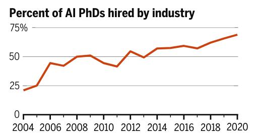 在过去十年中,AI 人才的需求骤升导致了 AI 人才竞争的加剧。然而,业界正在赢得这场竞赛。来自北美州的众多大学的数据显示,专门研究 AI 的计算机科学(CS)博士毕业生正以前所未有的数量进入业界。2004 年,只有 21% 的 AI 博士进入业界,但到 2020 年,这一数量占比高达 70%。
