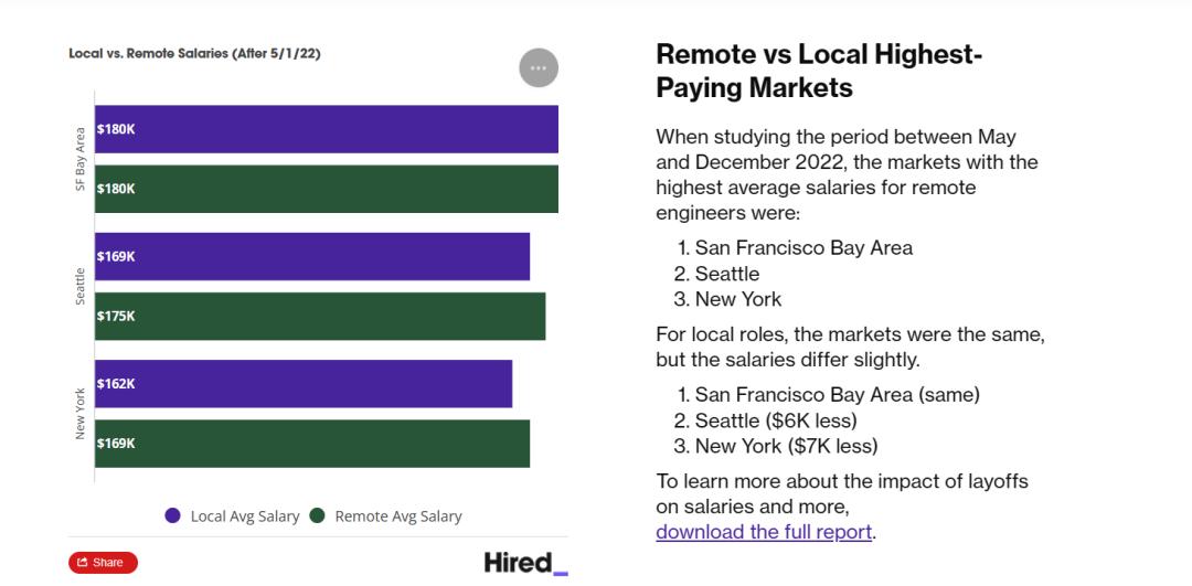 在裁员期间,旧金山湾区的远程办公工资最高,为18万美元,其次是西雅图达到 17.5 万美元,纽约为 16.9 万美元。