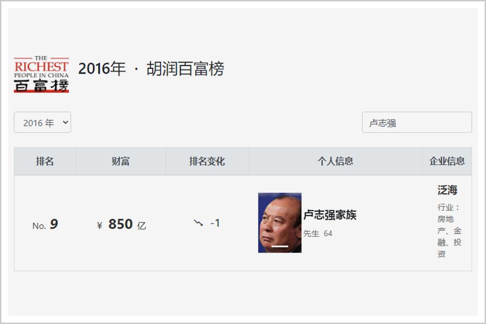 2016年,卢志强的身家达到850亿的顶峰,在“胡润百富榜”上名列第九。
