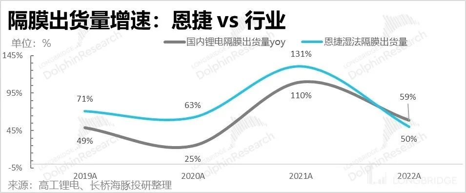 从 2022 年的行业趋势来看,恩捷作为行业龙头出货增速其实是落后于行业的,主要是因为恩捷没有干法隔膜的出货产能,没有充分享受到储能爆发性增长带来的隔膜需求。