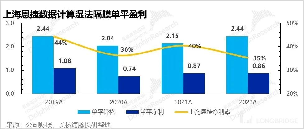 而湿法隔膜的经营主体就是上海恩捷,按照海豚君粗估数据,假设 2022 年恩捷股份湿法隔膜出货量 45 亿平,基本可以看到,虽然单平价格因为涂覆膜占比的提升综合均价提升明显,但 2022 年单平净利并未提升,是 0.86 元,导致净利润率下滑明显。
