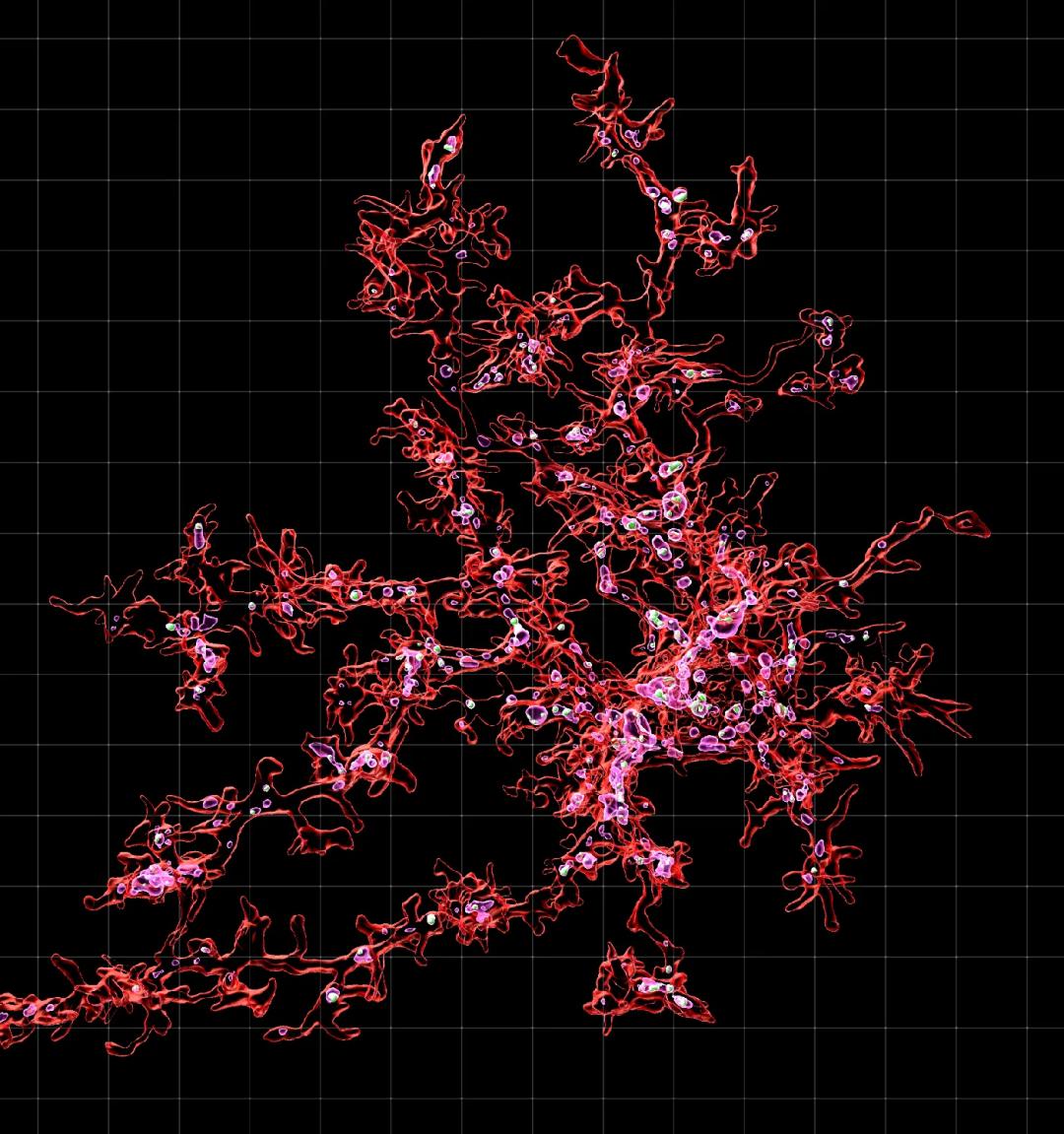 在这张显微影像中洋红色的结构勾勒出的是脑中的免疫系统中的一个小胶质细胞内的溶酶体。溶酶体内部的绿色部分是这个细胞在清除受损的神经元时吞噬的突触物质。—Javier Rueda-Carrasco/Soyon Hong lab/UK DRI at UCL