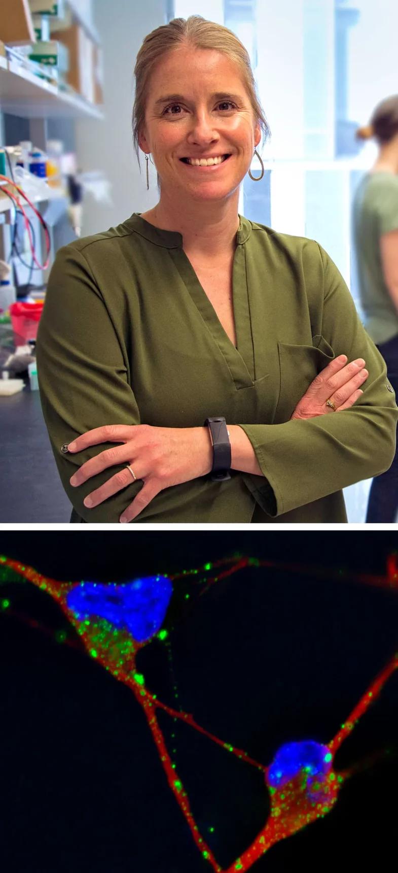 杰西卡·杨( Jessica Young)的研究可能导致或促成阿尔茨海默病的细胞内体-溶酶体通路的功能障碍。下图为阿尔茨海默病患者干细胞研究的显微照片,其中的绿点为神经元内扩大的核内体。—From top: University of Washington; Allison Knupp/Young Lab