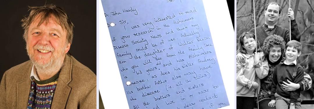 从左至右依次为:研究者约翰·哈迪,他的关键性工作发现了詹宁斯一家所遗传的早发性阿尔茨海默病与一种基因变异相关;卡罗尔·詹宁斯1986年写给哈迪的那封信;卡罗尔·詹宁斯,她的丈夫和两个孩子,照片拍摄于1992年。—From left: Courtesy of UCL QS IoN Medical Illustration; Courtesy of the BBC and Stuart Jennings; Ross Kinnaird/PA Images/Alamy Stock Photo