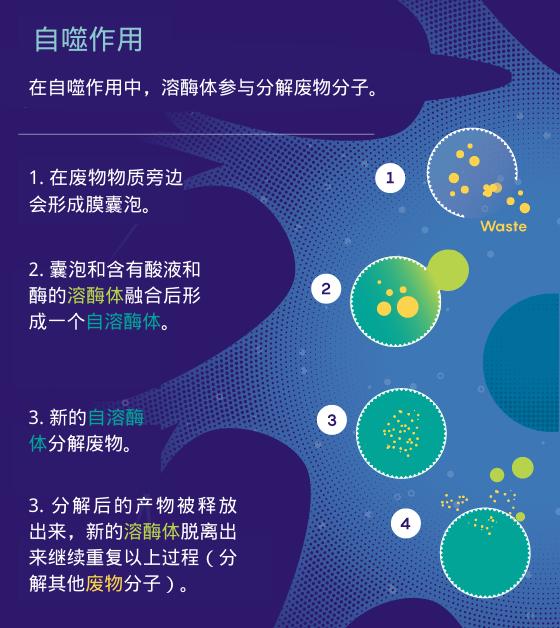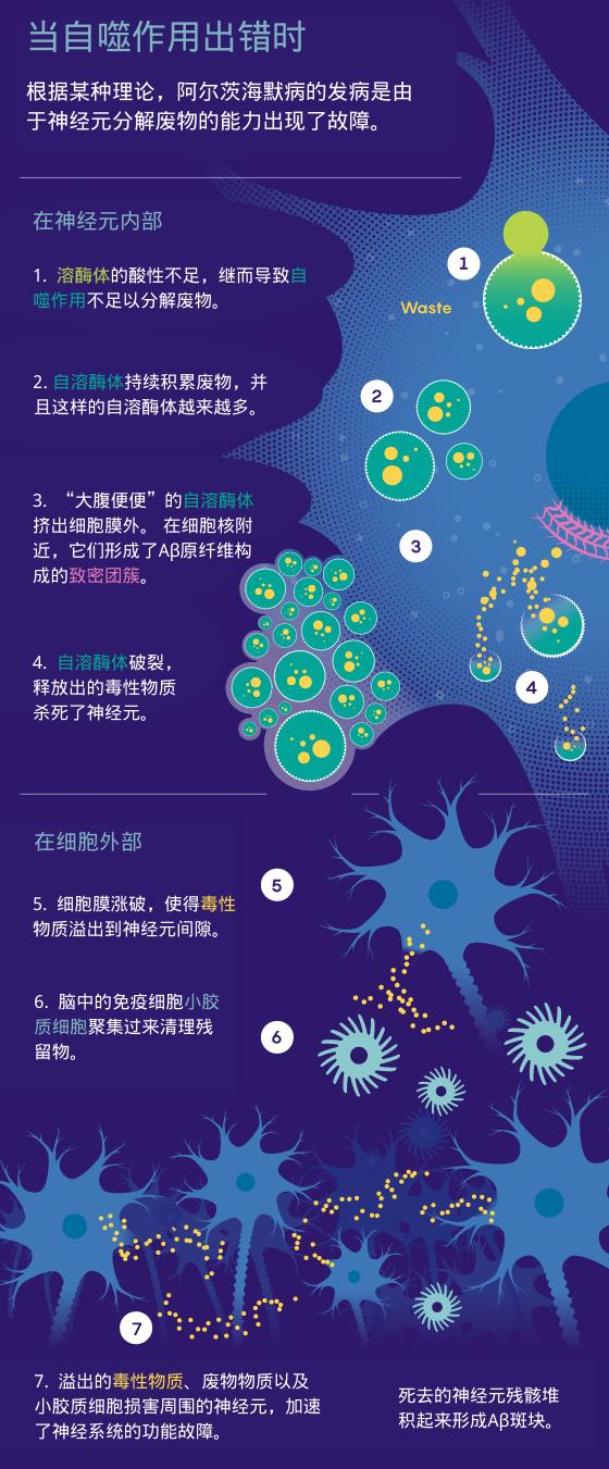 来自比利时的生物化学家克里斯蒂安·德·杜夫(Christian de Duve)在20世纪50年代发现了溶酶体,由于溶酶体在一种至关重要的(但在当时的了解并不多)叫做自噬(autophagy)的过程中发挥作用,人们有时称之为称为“自杀包”(suicide bags)。溶酶体是一种内含酸性浆液的膜囊泡(membrane vesicles),浆液中的酶能分解不再被需要的分子、细胞器等,包括可能具有潜在危害的错误折叠蛋白质以及病原体。自噬是必不可少的过程,但与身体其他部位的细胞相比起来,这一过程对神经元尤其关键,因为成熟的神经元不会分裂和更替。他们必须要保持存活。