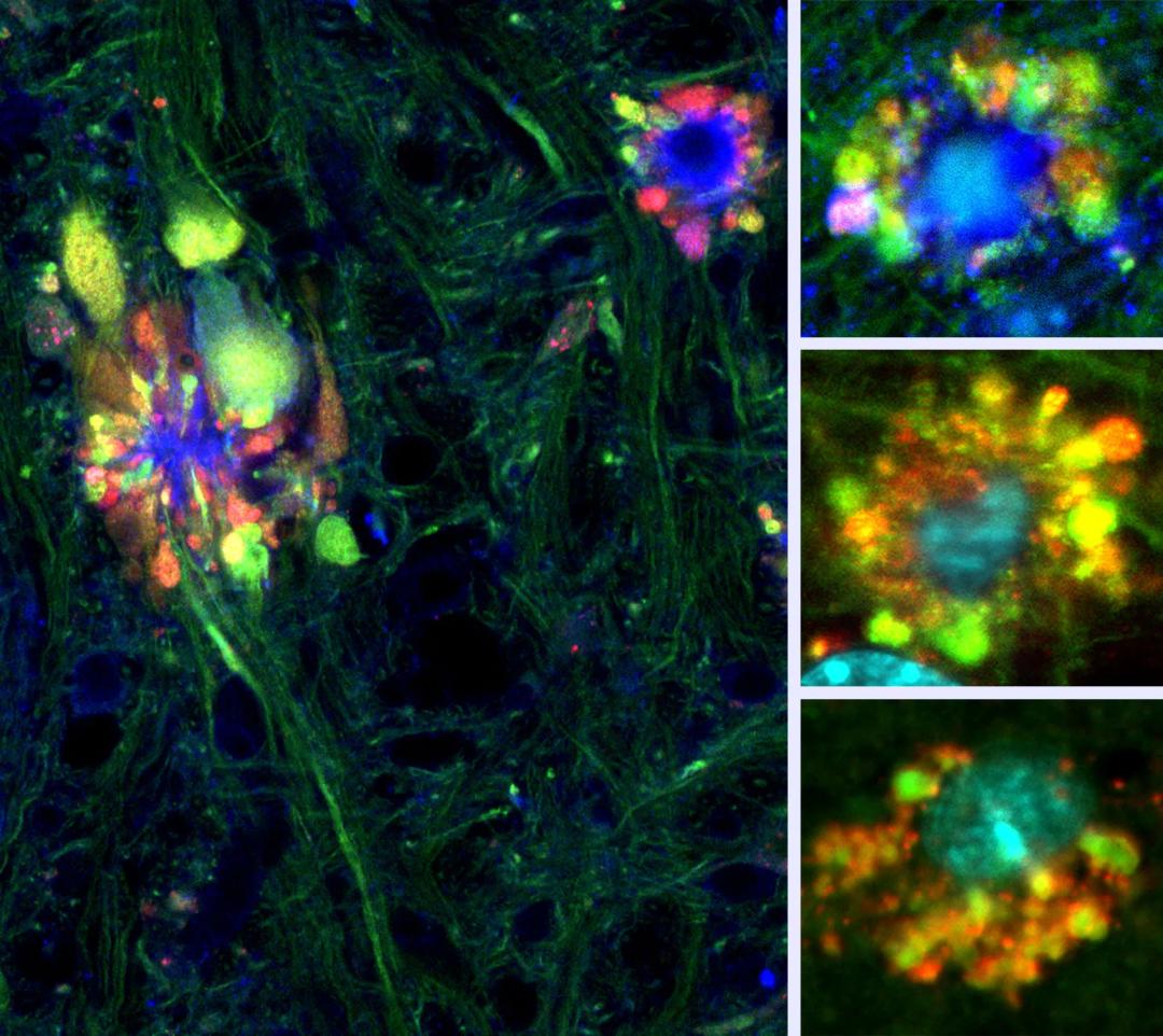 因为他们最初的发现是在小鼠上进行的,研究团队试图在人类组织样本上寻找类似的PANTHOS神经元。有了明确的目标之后,他们轻而易举就找到了。巨大的共聚焦显微镜占据了尼克松实验室那间黑暗和布满灰尘的房间的一半,研究科学家菲利普·斯塔夫里德斯(Philip Stavrides)坐在控制端,上下调整显微镜的视野,观察人类AD患者的脑组织样本。明亮地绽放着的绿色、红色和蓝色的毒性“花朵”充满整个荧光屏。
