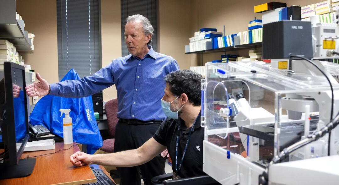 在尼克松位于内森·S·克莱恩精神病研究所的实验室里,他和他的同事菲利普·斯塔夫里德斯在观察阿尔茨海默病患者脑组织的显微镜下影像。—Karen Dias for Quanta Magazine
