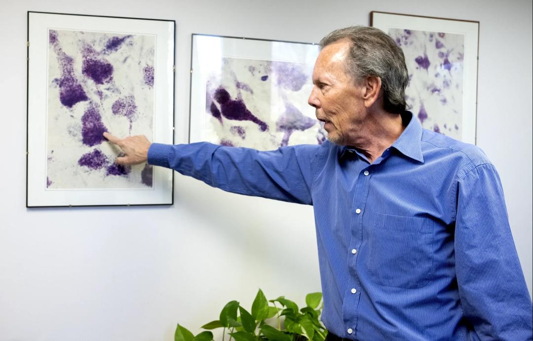 在尼克松办公室的墙上挂着一组裱框的显微镜下照片,图片是大约30年前在他的实验室拍摄的一位AD患者的脑子。尼克松指向照片中的一大块紫色斑点。