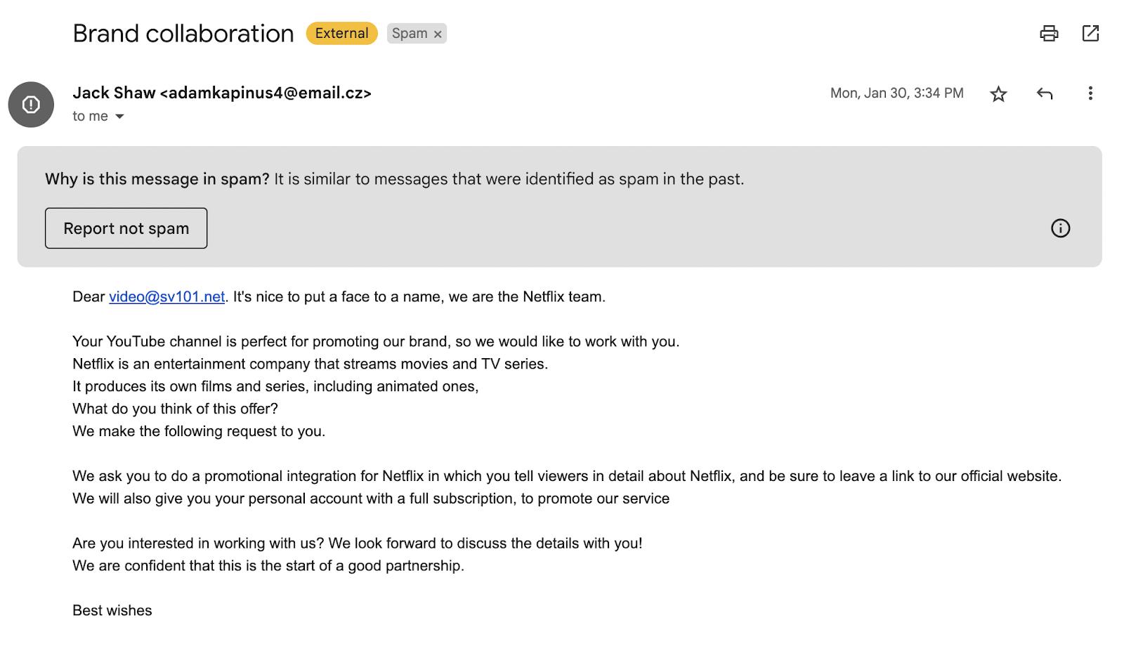 ChatGPT普及之后,其实最直接的危害之一就是诈骗成本的下降以及骗术的一个提升,举个例子:在ChatGPT之前,社会上的诈骗手法就已经很多了。邮件,短信,打电话,可以说是全方位轰炸。但是还好,一般骗子的文化程度不高,所以写出来的内容还是比较容易甄别的。比如说,最近我们公司邮箱收到这样一封自称来自Netflix团队发来的合作邮件,那么这一看就很像钓鱼邮件对吧?首先,邮箱不是Netflix的公司邮箱,这种后缀一般都有问题,其次,整个排版非常的不专业,还有就是各种标点符号、落款都不专业。但最容易暴露的就是表达和语法错误,这一看就是一个英文很差的人写的。比如说这句话we look forward to discuss the details with you. 我忘了是初中还是高中学的这个用法,但是,但凡有能达到英文职场水平的都知道,look forward to后面应该加doing sth. 等等,通篇都是这样的英文错误。