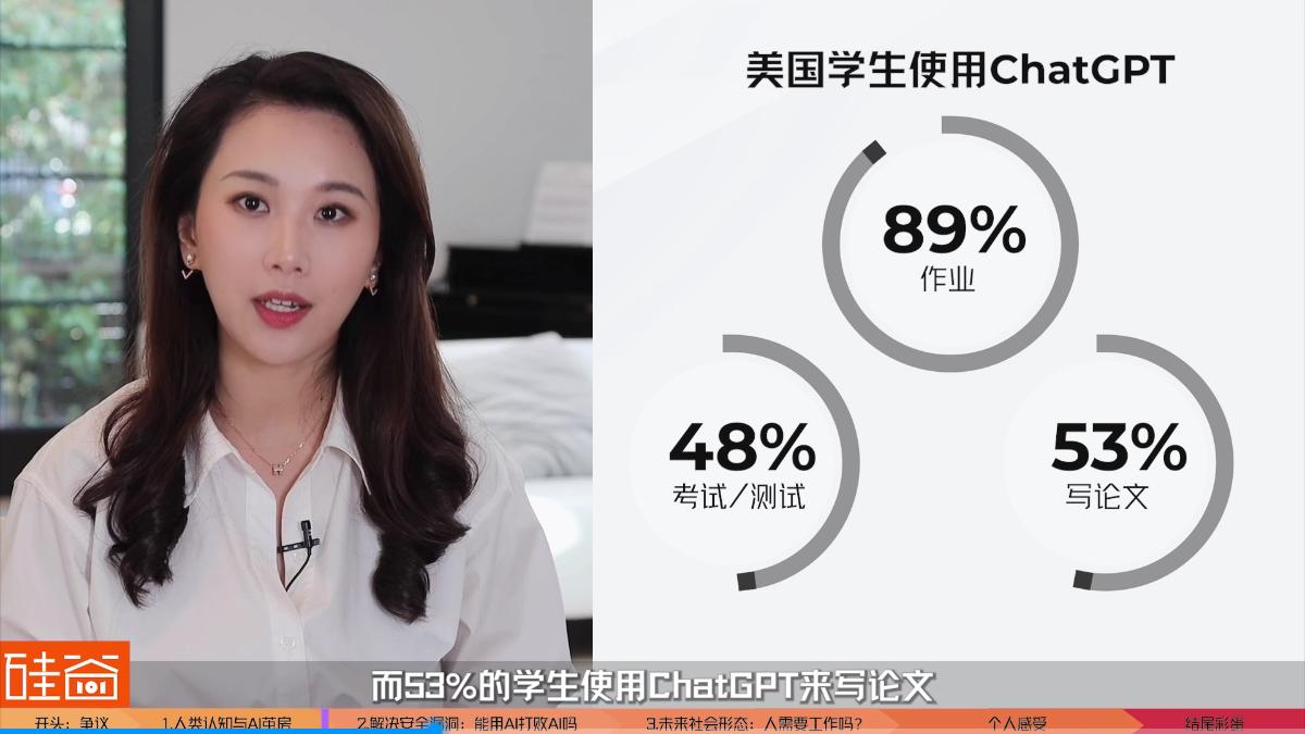 就像刚才王咏刚老师说的,ChatGPT最开始冲击的就是我们的教育体系。自去年底OpenAI开放ChatGPT之后,Study.com的数据就显示,美国89%的学生已经在作业里面使用ChatGPT了,48%的学生在考试或测验中使用过ChatGPT,而53%的学生使用ChatGPT来写论文。