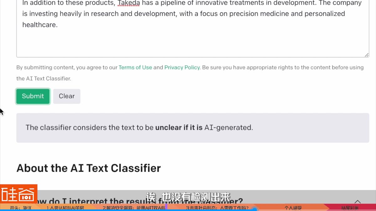 但是,这些内容都有点低级,我们再试试一个偏僻一点的词,比如说:武田制药,Takeda Pharmaceutical,这是总部在日本的生物制药企业。ChatGPT生成了解释之后,放去斯坦福的DetectGPT上测,诶,这不,就没测出来是ChatGPT写的。斯坦福的这款检测工具是针对GPT-2来开发的,ChatGPT是基于GPT-3.5开发的,所以GPT-2相当于ChatGPT的前前版本了,参数要少很多,信息量也不够、数据库也不够新。所以我们再放到OpenAI自己出的检测器AI Text Classifier上试试呢?