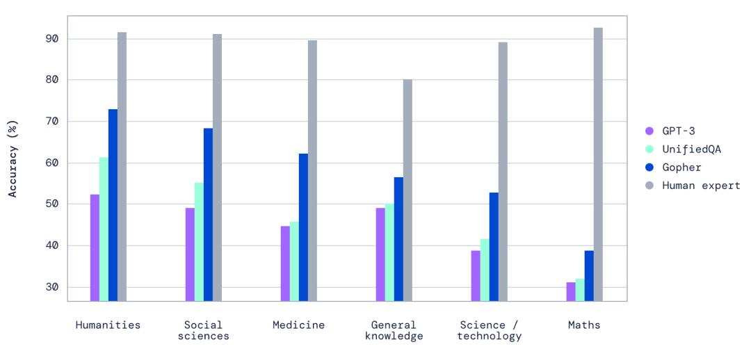 这篇论文讲述了基于 GoogleTransformer 的各种语言模型在规模与性能上的比对,从数千万参数的模型再到 2800 亿参数量量的 Gopher 模型,研究人员发现规模收益主要体现在阅读理解和内容审查方面,而在逻辑和数学推理的收益较小,比如 Gopher 模型在以下几个垂直知识领域甚至超过了当时的 GPT-3 和人类专家。