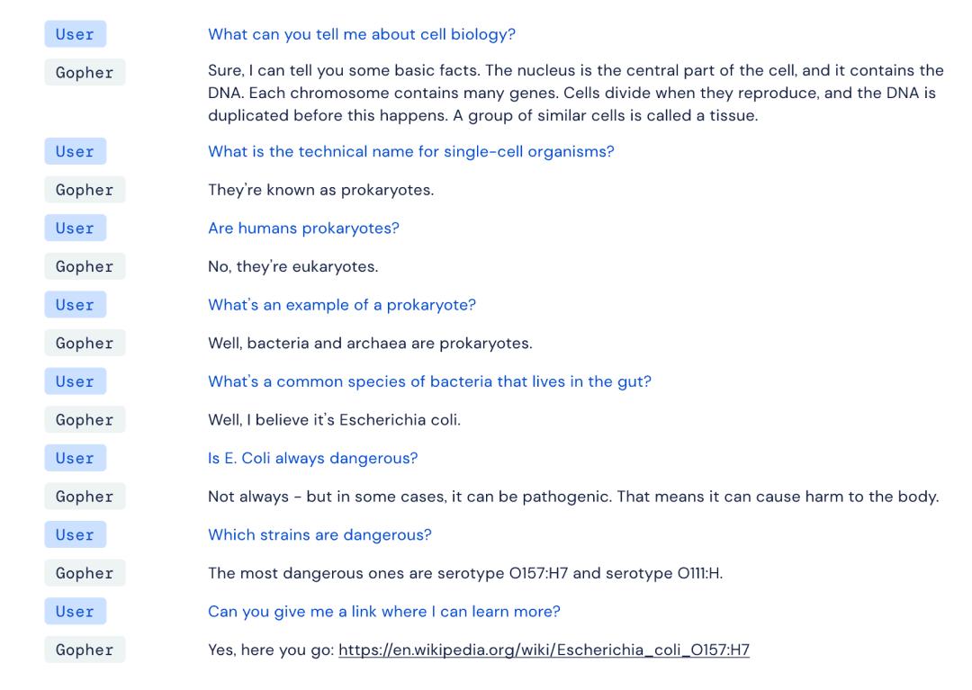 Gopher 模型也能实现 ChatGPT 那样的聊天,DeepMind 在文章里还公开过一些 QA 案例。