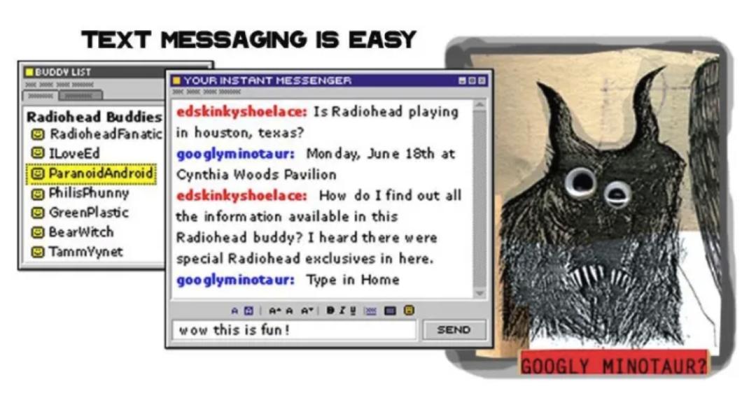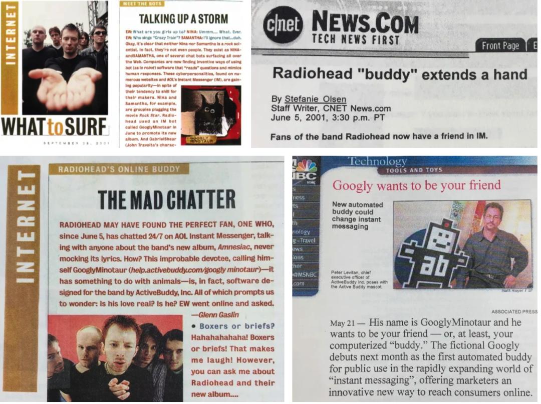 举个例子,Radiohead 当时在其第 5 张专辑《Amnesiac》中推出名为 GoolyMinotaur(Gooly) 的角色,Gooly 也是 ActiveBuddy 推出的定制化音乐机器人。