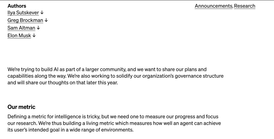 回到当年 OpenAI 成立不久,Musk 还同 Greg Brockman、Sam Altman 以及 Ilya Sutskever 一同署名了一篇文章《OpenAI technical goals,OpenAI’s mission is to build safe AI, and ensure AI’s benefits are as widely and evenly distributed as possible 》,也是登在 OpenAI 官网的唯一一篇Musk 以作者身份署名的文章,开头如下: