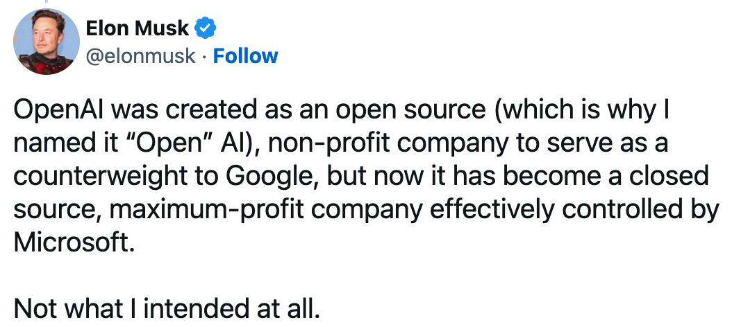 那么这个「Based AI」想做什么呢?其实又回到了 OpenAI 成立之初,Elon Musk 所畅想的愿景与使命,毕竟 OpenAI 现在的状态可不是原先 Musk 所想的那样,OpenAI 成立之初非营利的性质是为了防止 Google 作恶,现在 OpenAI 变成了另一个硅谷巨头微软变相控制的企业,且以盈利导向,好家伙,非但原先的假想敌没干掉,还一下变成俩,这怎么搞?