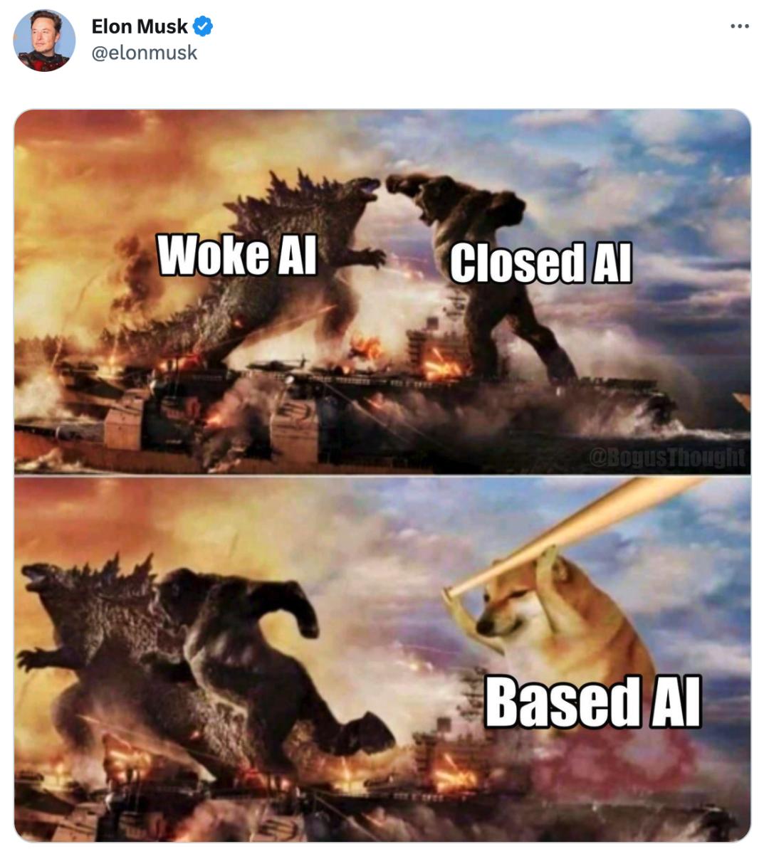 报道出来的同一天,Musk 其实还在 Twitter 上发了一个表情包,名为「Based AI」的 Doge 手持大棒打跑了 「Woke AI」以及「Closed AI」,不知道是不是分别暗指 DeepMind 和 OpenAI 这两家 :D,但无论如何还会出现一个第三方,并且是 Musk 主导的,暂且叫「Based AI」。