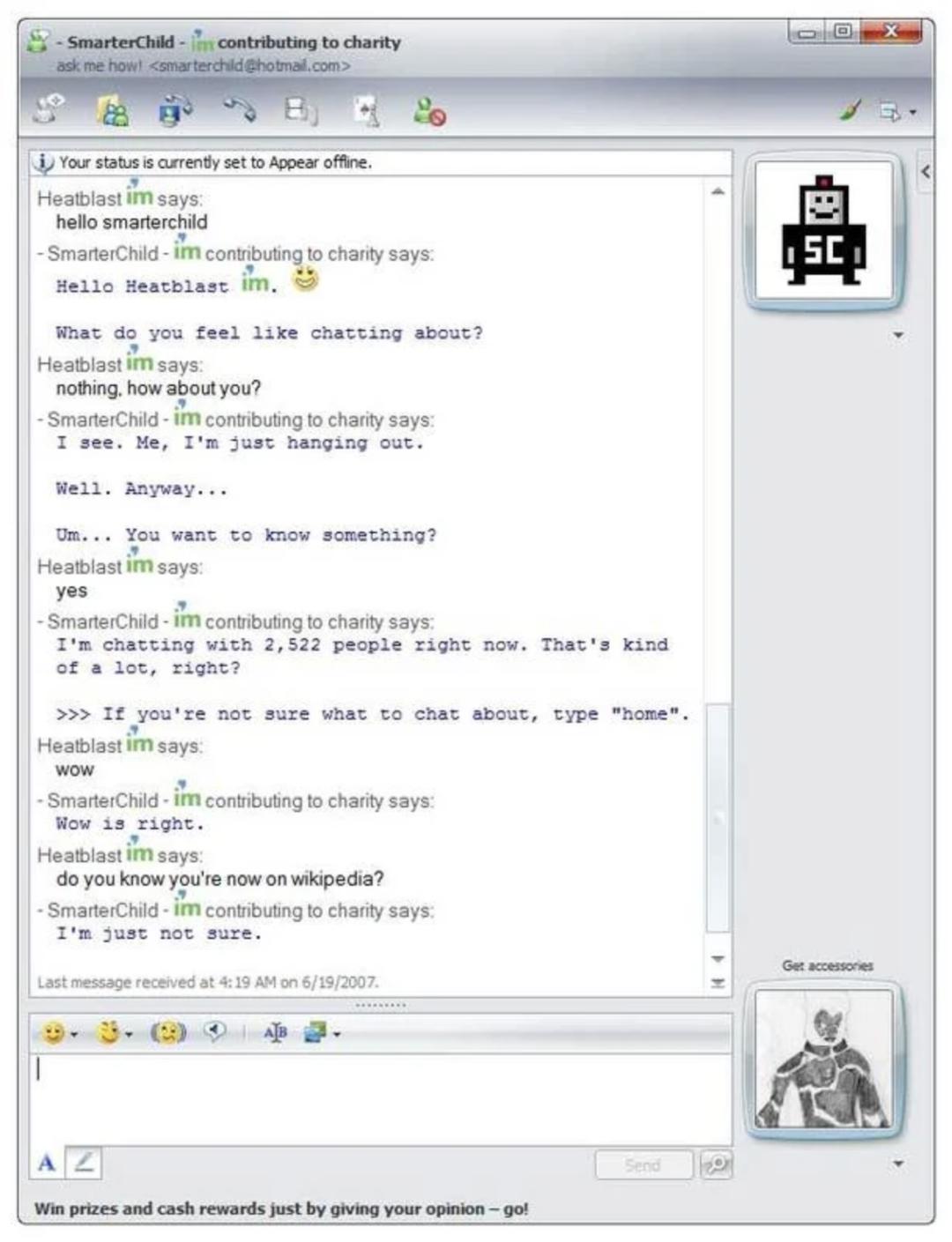 当然,故事的结局是 SmarterChild 没有活到成年,不然现在也没有 ChatGPT 什么事了,原因自然和微软脱不了干系。