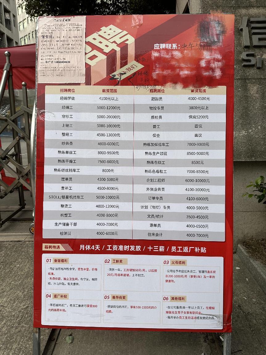 泉州鞋材企业信泰集团2023年2月的招聘启事,同一工种薪酬浮动很大,熟练工薪酬7000元为底价,不少10000元以上;摄影/辛晓彤