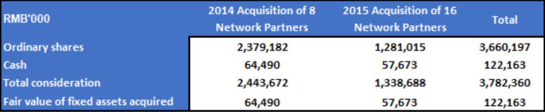 我们展示了中通如何利用2014年和2015年的收购去实现内部账目的平衡。公司文件显示,中通以极高的溢价从关联方处收购了加盟商。