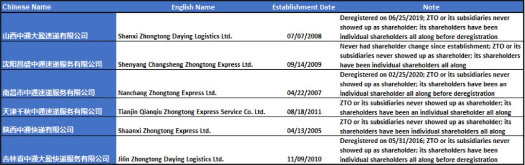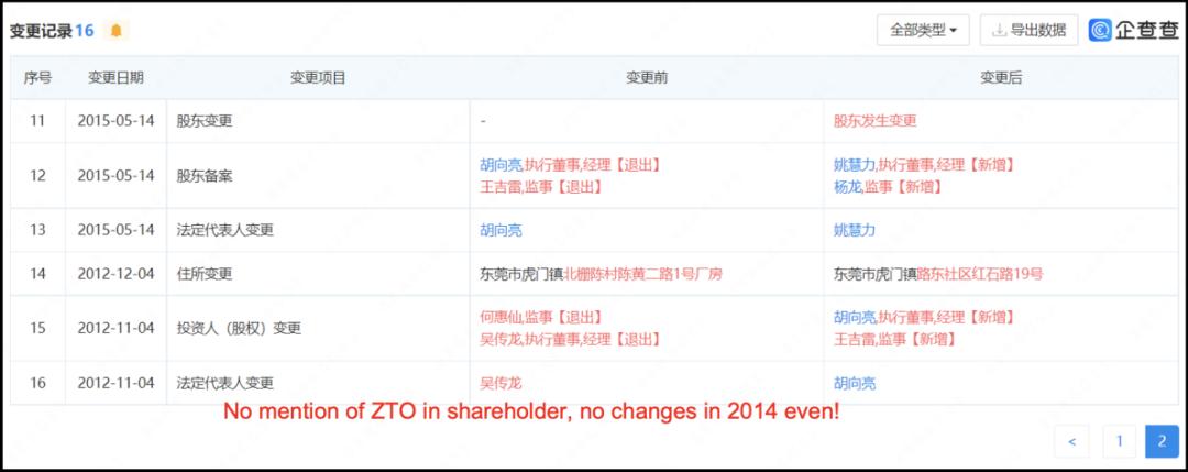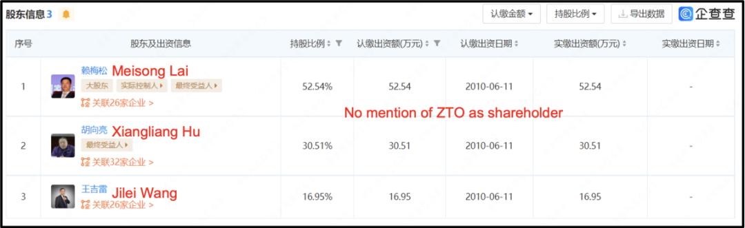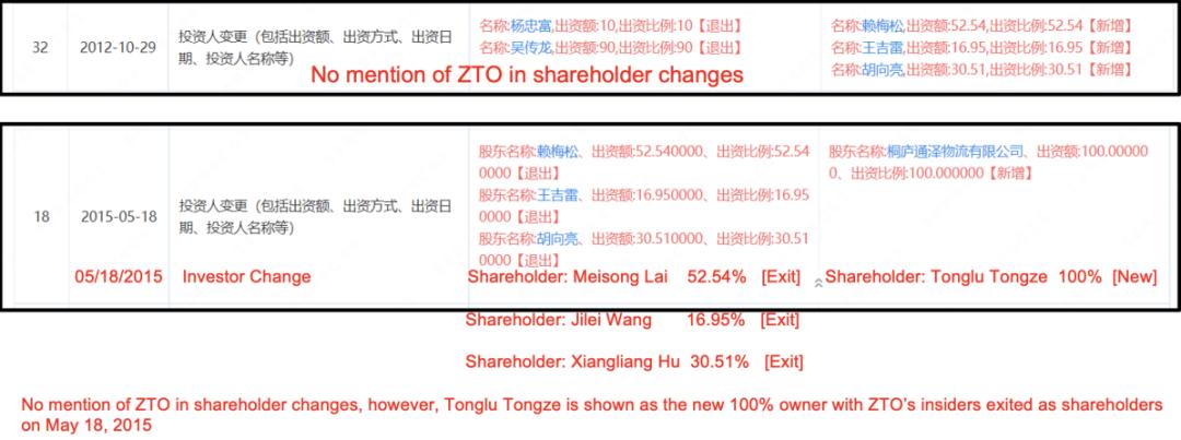 更令人担忧的是,在中国的记录中,交易后加盟商的所有权并没有发生变化。正如我们所展示的,我们认为可能是这些实体已经作为中通的子公司在运作。中通股东的增资或许没有购买任何实体。
