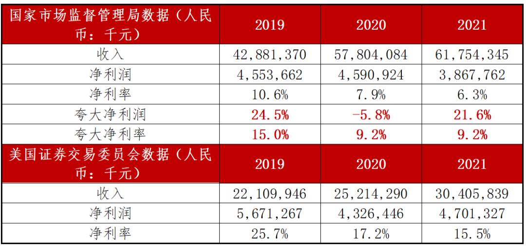 中国工商总局提交的文件显示,2019年至2021年的净利率从6.3%升至10.6%,而该公司在向SEC递交的财务报表中相对应的利润率为15.5%升至25.7%。