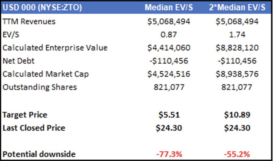 假设整个同行业群体EV/S数据达到可观的2倍,中通的目标价格约为每股6美元至11美元。这一计算的目标价格意味着较当前交易价格应下跌约55-77%。