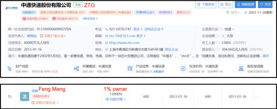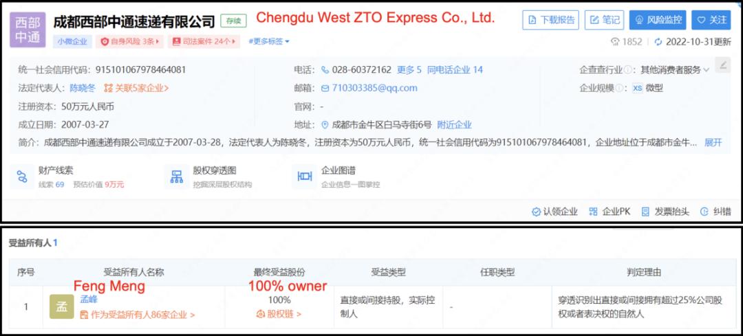 企查查显示,成都西部由孟峰100%持股。孟峰是中通在中国VIE实体(可变利益实体)的1%所有者,据报道,孟峰也是中通首席执行官助理和中通冷链部门的首席执行官。