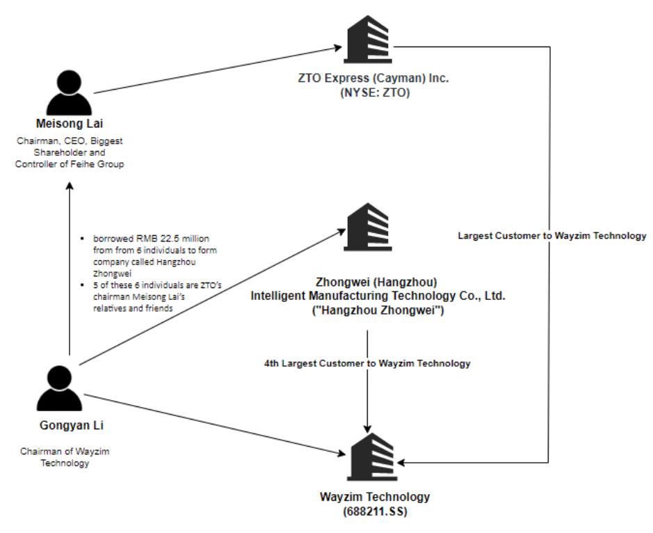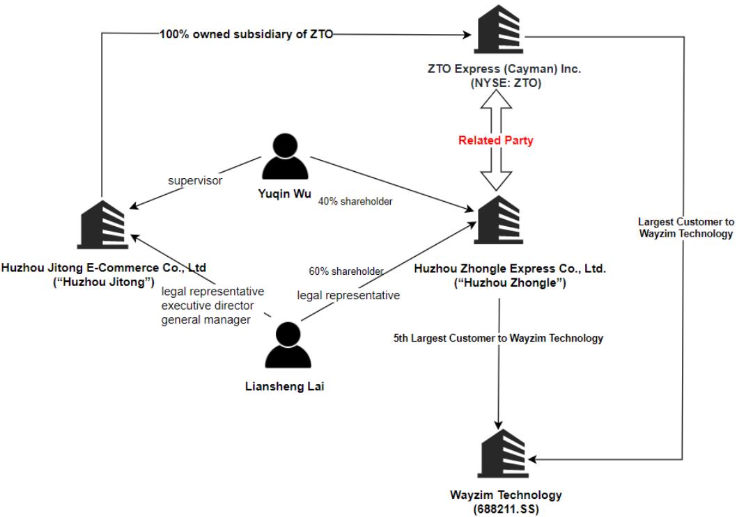 我们认为,中通的管理层很可能参与了未披露的关联方交易,以使中科微至及其创始人李功燕受益。下图显示了中通与中科微至以及李功燕和赖梅松之间的关系。