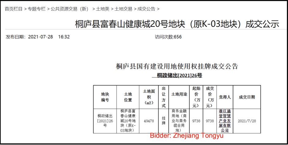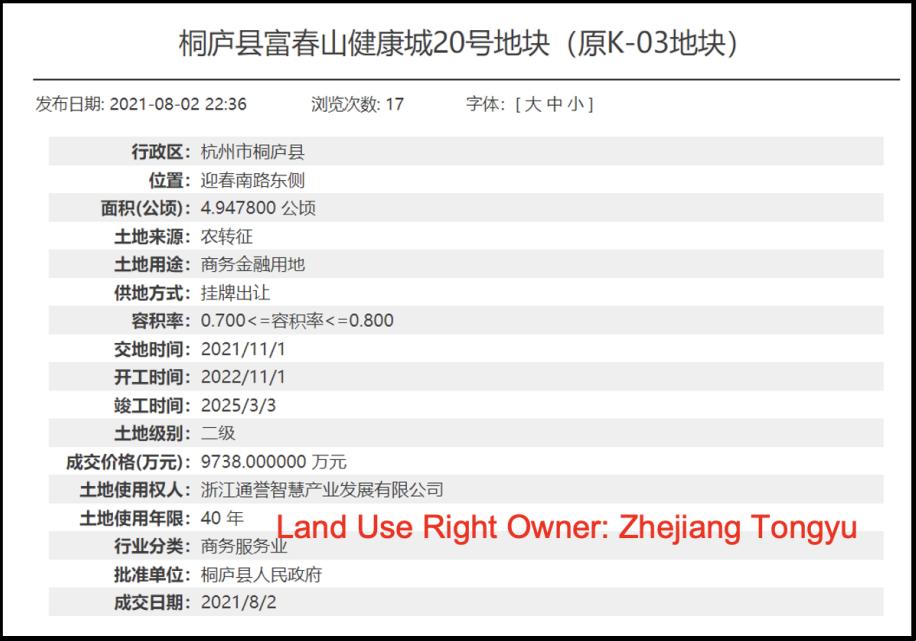 桐庐县地方政府披露显示,浙江通誉于2021年7月28日以人民币9,738万元的价格购买土地,土地用途为商务金融用地。土地总面积为49,478平方米。