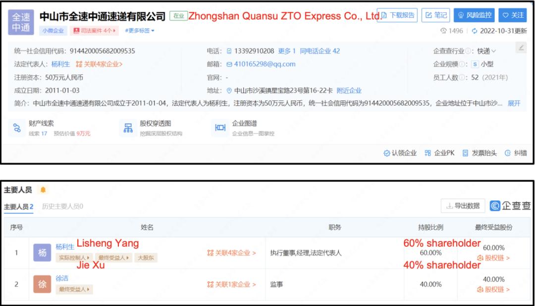 企查查显示,杨利生和徐洁两人分别拥有中山全速60%和40%的股全。中山泉速将中通列为其商标,表明其作为中通实体运营。