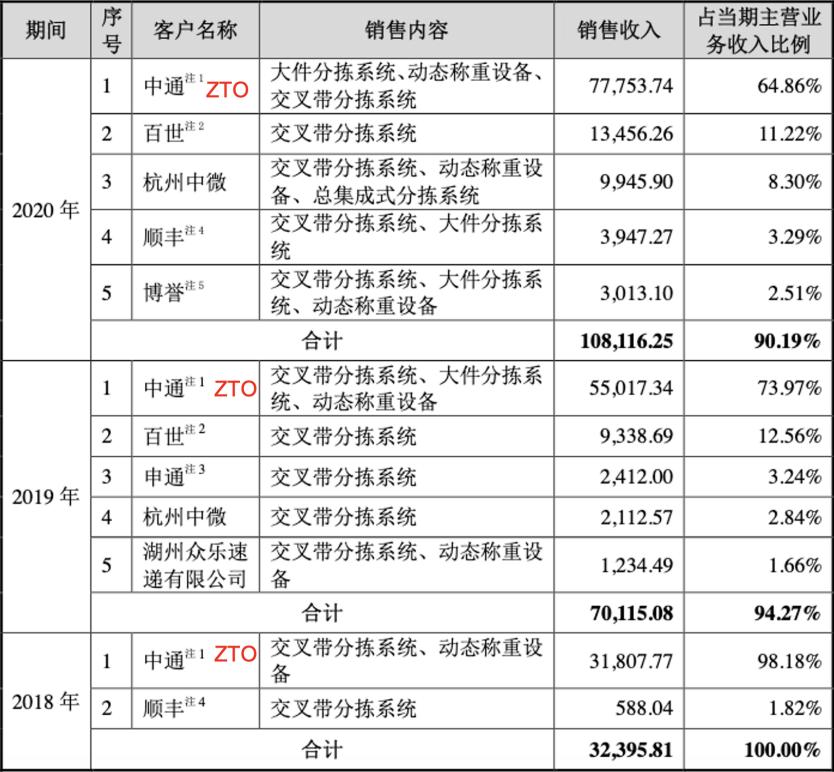 根据招股书,从2018年到2020年,中通一直是中科微至的最大客户。尽管中通为中科微至带来的收入已从2018年的98.2%降至2020年的64.9%,但如今,中科微至对中通大客户的依赖性仍然十分明显。