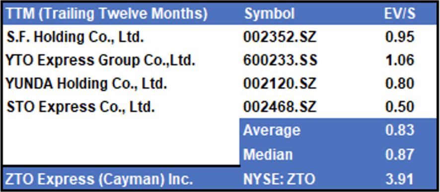 由于我们对中通报告的利润率表示怀疑,我们认为企业销售价值(EV/S)倍数是比较合适的参考指标。