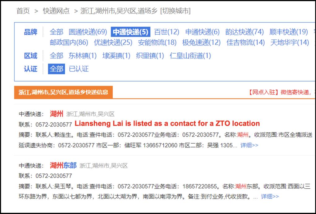 如上图所示,我们还发现赖连生被列为中通湖州办事处的主要联系人。