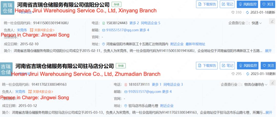 还有另外两家公司均由中通100%控股,注册地址与河南中通快递相同。这些实体分别是河南省吉瑞物流有限公司,(河南吉瑞)和河南省吉瑞仓储服务有限公司(吉瑞仓储)。