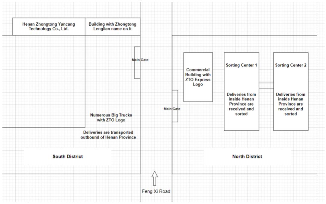 我们还找到了两个分拣中心,并了解到中通将从河南省内接收货物,然后在这里分拣这些货物。