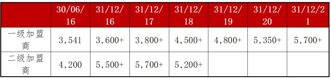 根据该公司的披露,自2016年以来,其一级加盟商从2016年的约3,500增加到截至2021年12月31日的5,700+。根据其2021年年度报告,公司与其二级加盟商之间的关系描述如下: