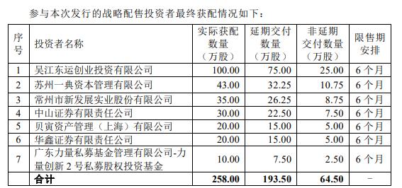 在已完成缴款的战略配售环节,明阳科技引入吴江东运创业投资有限公司 、中山证券、华鑫等7家战投。本次发行战略配售股份合计258.00万股,占本次发行规模的20.00%(不含超额配售部分股票数量),发行价格为11.88元/股,战略配售募集资金金额合计3065.04万元。