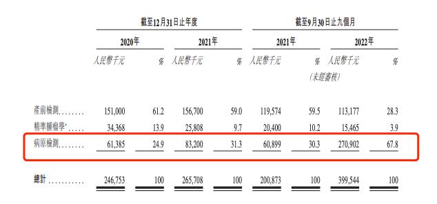 作为北京少数首批获授权提供COVID-19核酸检测服务的公司之一,优迅医学的多数收入来自核酸检测。2022年前三个季度,公司的病原检测收入占总收入的67.8%。